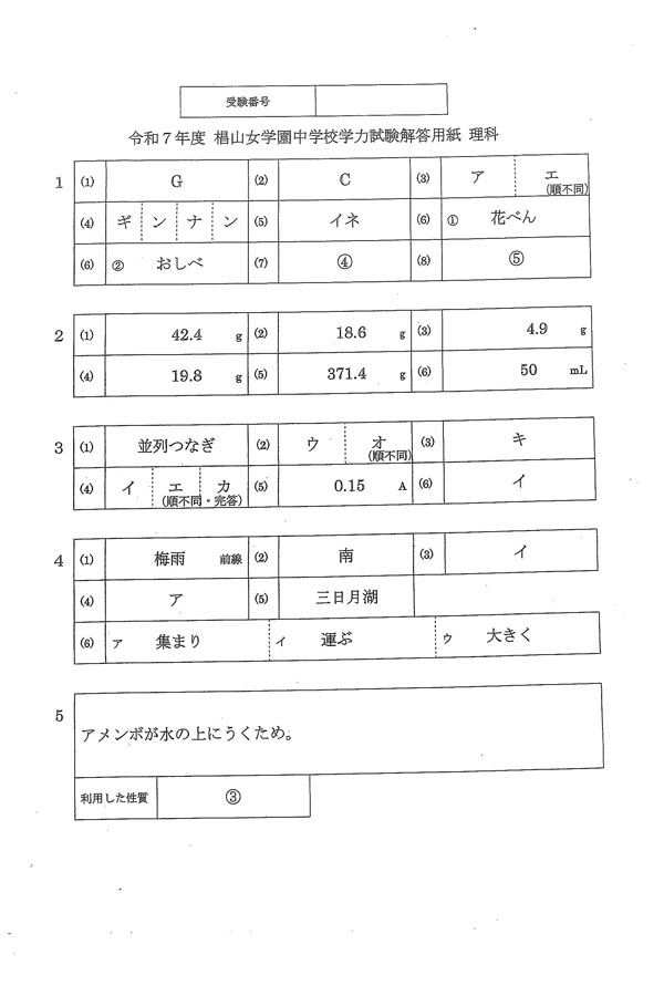 令和7年度入試過去問題(理科 解答)(1ページ目)|椙山女学園中学校の入試過去問