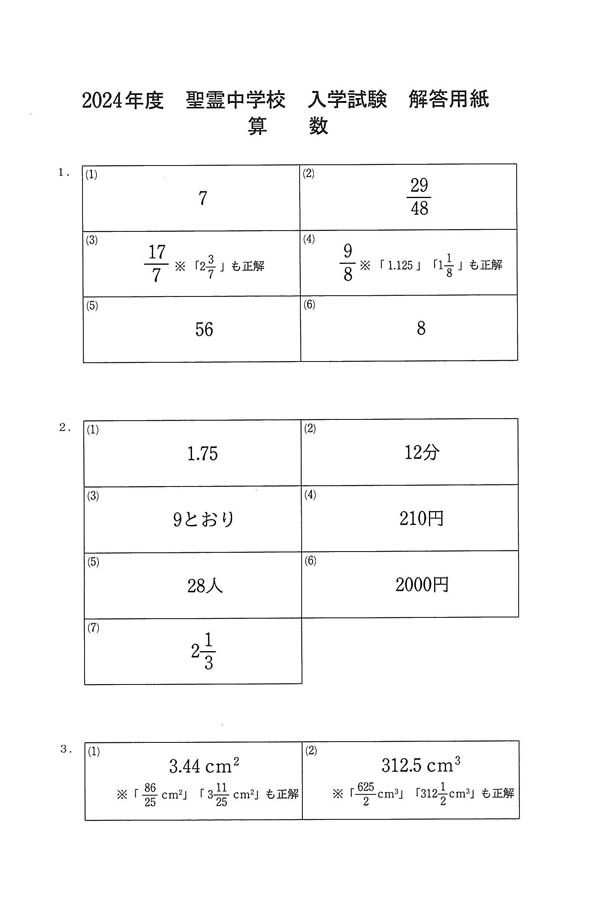 2024年度入試過去問題(算数 解答)(1ページ目)|聖霊中学校の入試過去問