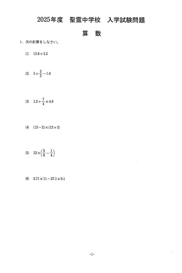 2025年度入試過去問題(算数 問題)(1ページ目)|聖霊中学校の入試過去問