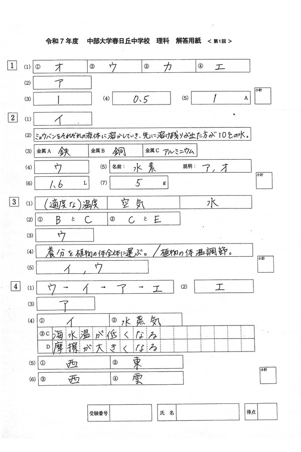 令和7年度入試過去問題(第1回)(理科 解答)(1ページ目)|中部大学春日丘中学校の入試過去問