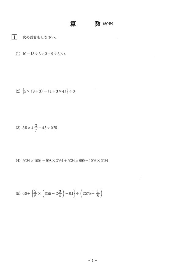 令和6年度入試過去問題 第1回(算数 問題)(1ページ目)|中部大学春日丘中学校の入試過去問