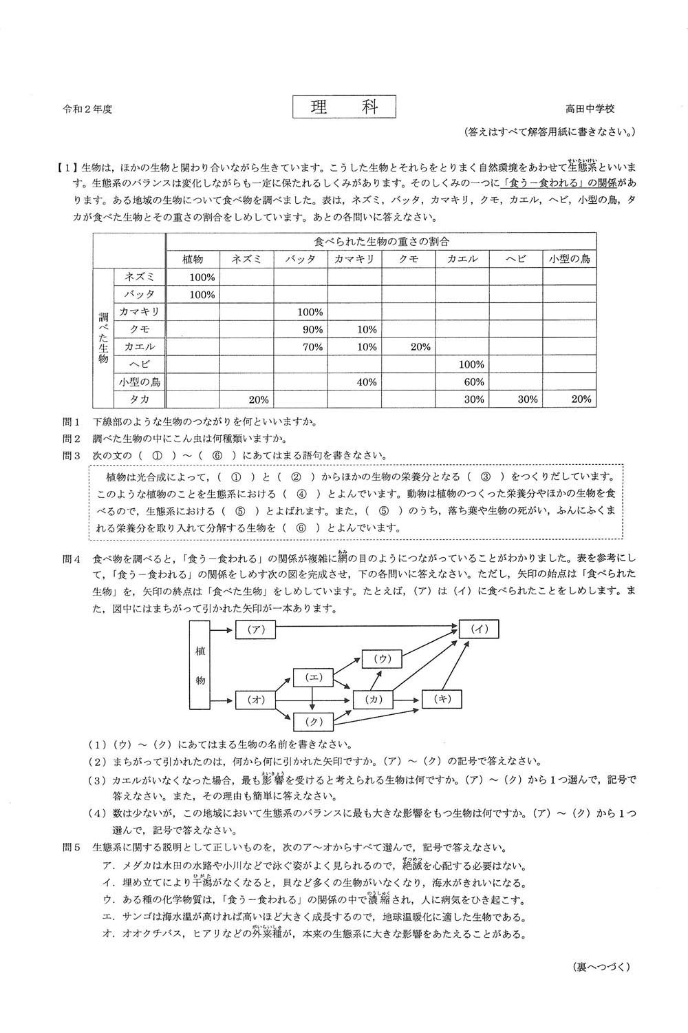 2020年度入試過去問題(理科 問題)(1ページ目)|高田中学校の入試過去問