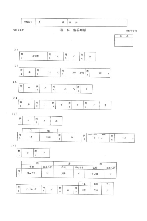 令和6年度入試過去問題(理科 解答)(1ページ目)|高田中学校の入試過去問