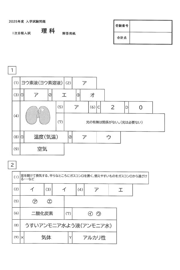 2025年度入試過去問題(1次)(理科 解答)(1ページ目)|近江兄弟社中学校の入試過去問