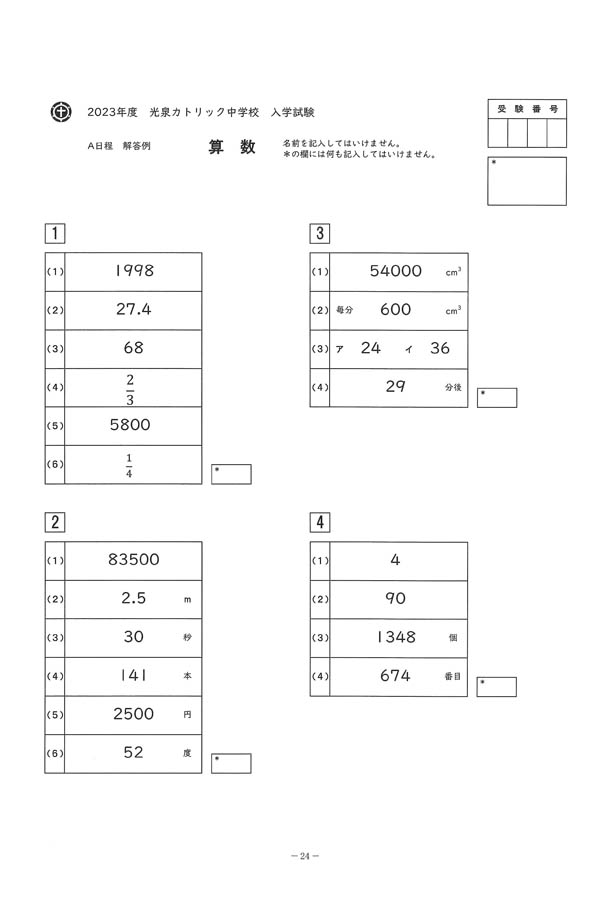 2023年度入試過去問題(算数 解答)(1ページ目)|光泉カトリック中学校の入試過去問