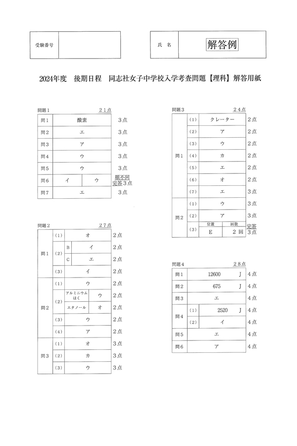 2024年度入試過去問題 後期(理科 解答)(1ページ目)|同志社女子中学校の入試過去問