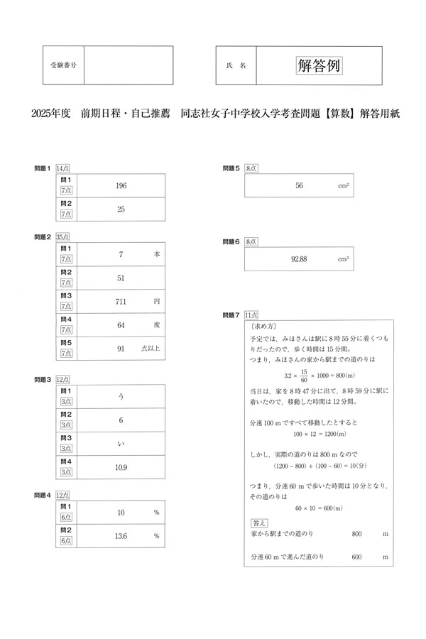 2025年度入試過去問題(前期)(算数 解答)(1ページ目)|同志社女子中学校の入試過去問