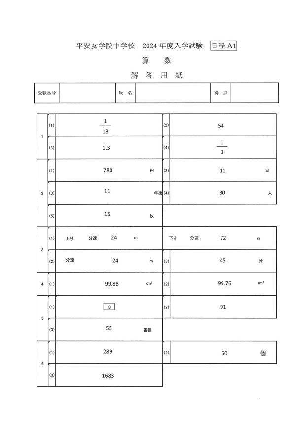 2024年度入試過去問題 A1日程 (算数 解答)(1ページ目)|平安女学院中学校の入試過去問