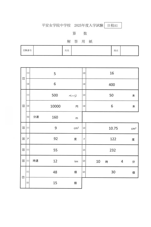 2025年度入試過去問題 A1日程 (算数 解答)(1ページ目)|平安女学院中学校の入試過去問