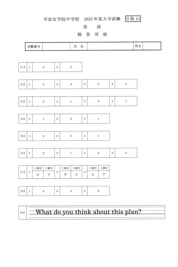 2025年度入試過去問題 A1日程 (英語 解答)(1ページ目)|平安女学院中学校の入試過去問