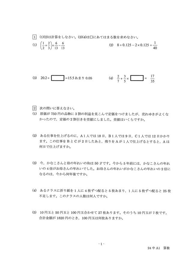 2024年度入試過去問題 A1日程 (算数 問題)(1ページ目)|平安女学院中学校の入試過去問