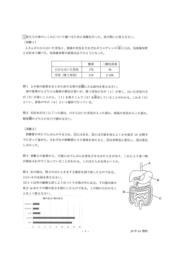 2024年度入試過去問題 A1日程 (理科 問題)(1ページ目)|平安女学院中学校の入試過去問
