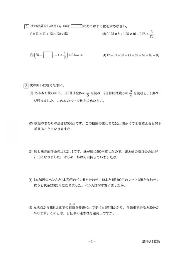 2025年度入試過去問題 A1日程 (算数 問題)(1ページ目)|平安女学院中学校の入試過去問