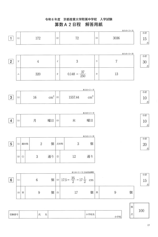 令和6年度入試過去問題 A2日程(算数 解答)(1ページ目)|京都産業大学附属中学校の入試過去問