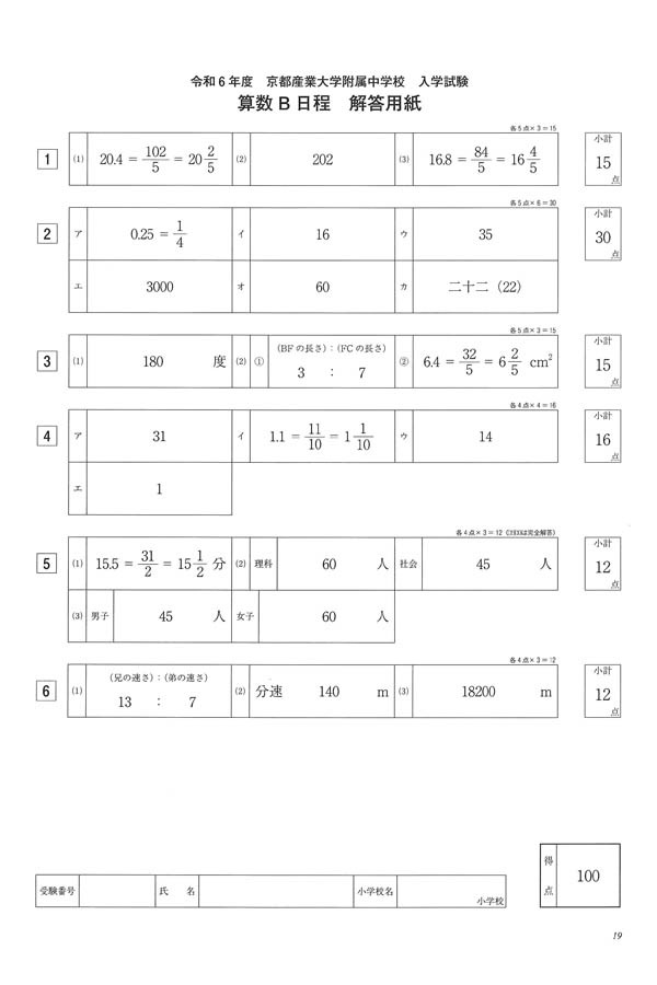 令和6年度入試過去問題 B日程(算数 解答)(1ページ目)|京都産業大学附属中学校の入試過去問