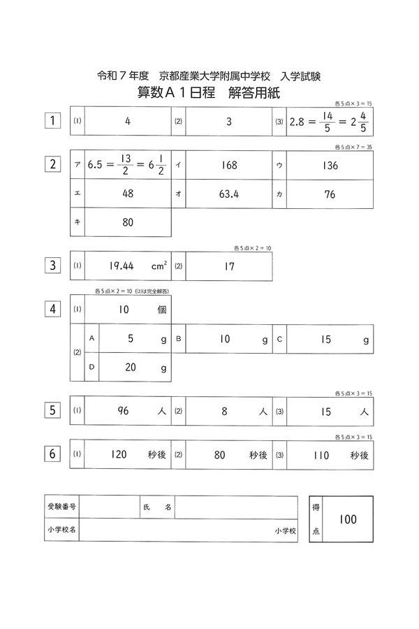 令和7年度入試過去問題(A1日程)(算数 解答)(1ページ目)|京都産業大学附属中学校の入試過去問