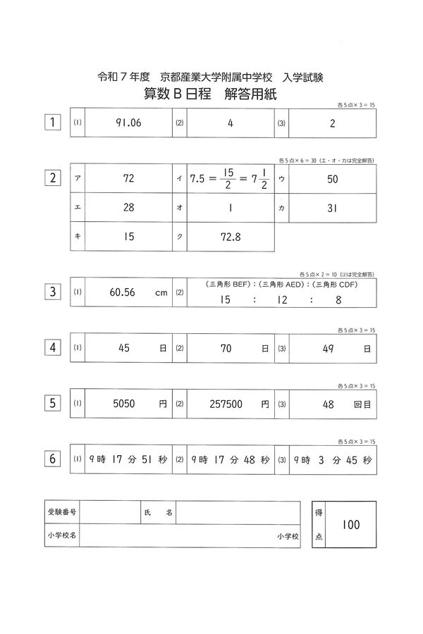 令和7年度入試過去問題(B日程)(算数 解答)(1ページ目)|京都産業大学附属中学校の入試過去問
