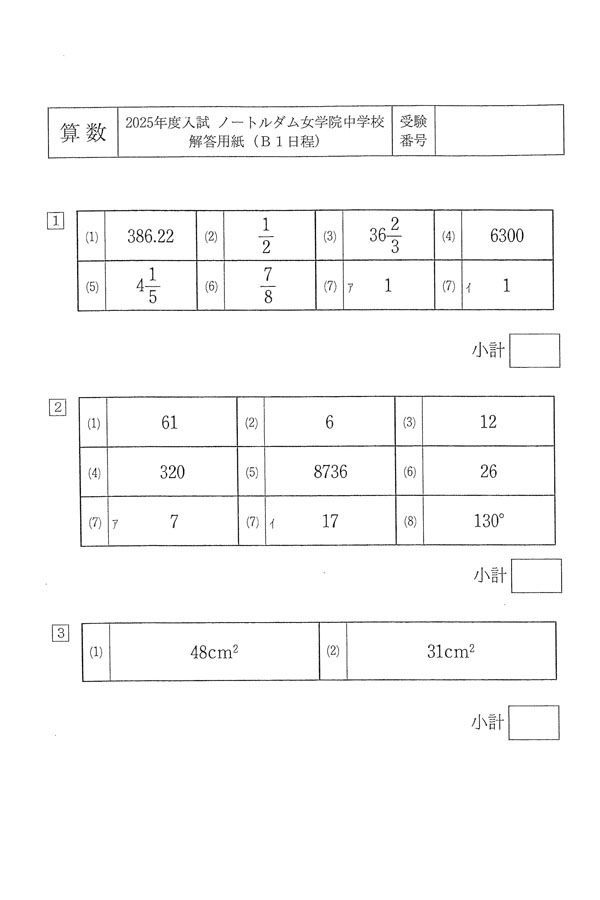2025年度入試過去問題(B1日程)(算数 解答)(1ページ目)|ノートルダム女学院中学校の入試過去問