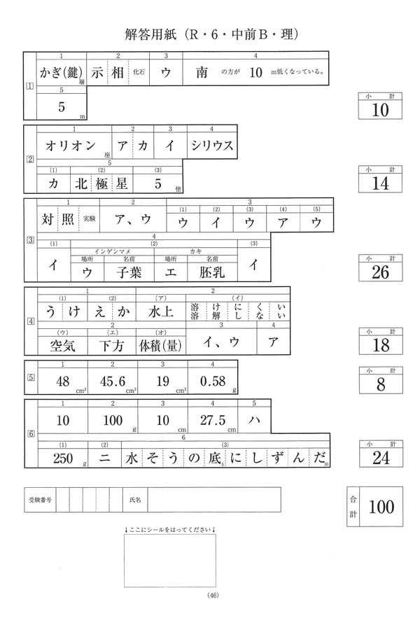 2024年度入試過去問題 前期B(理科 解答)(1ページ目)|東山中学校の入試過去問