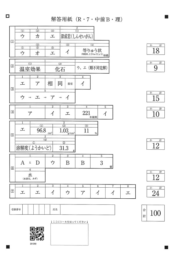 2025年度入試過去問題(前期B)(理科 解答)(1ページ目)|東山中学校の入試過去問