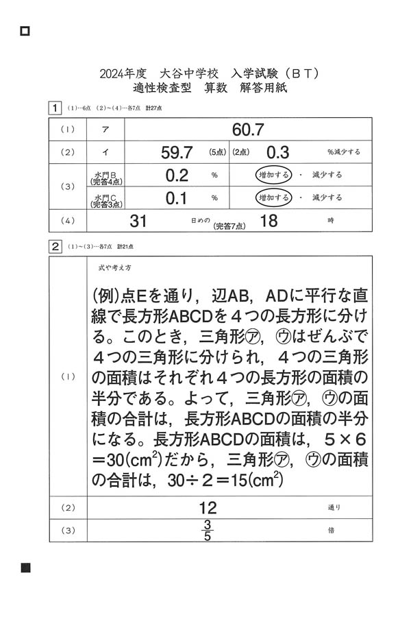 2024年度入試過去問題 BT日程(算数 解答)(1ページ目)|大谷中学校の入試過去問
