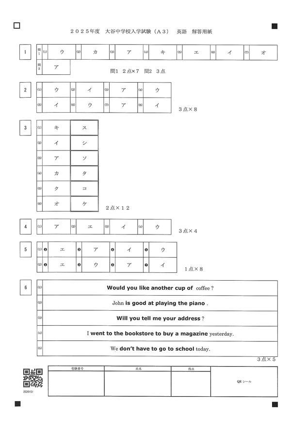 2025年度入試過去問題(A3日程)(英語 解答)(1ページ目)|大谷中学校の入試過去問