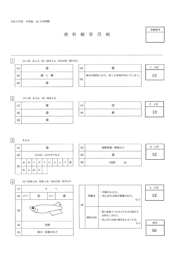 令和5年度入試過去問題 A1(理科 解答)(1ページ目)|龍谷大学付属平安中学校の入試過去問