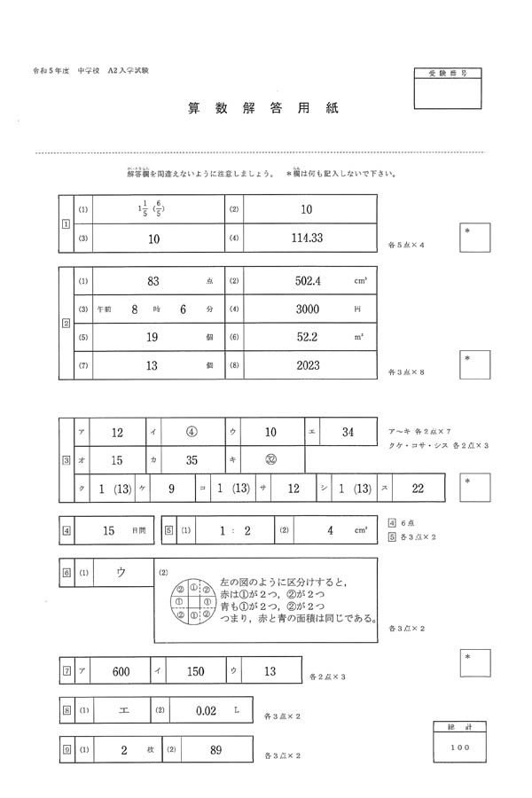 令和5年度入試過去問題 A2(算数 解答)(1ページ目)|龍谷大学付属平安中学校の入試過去問