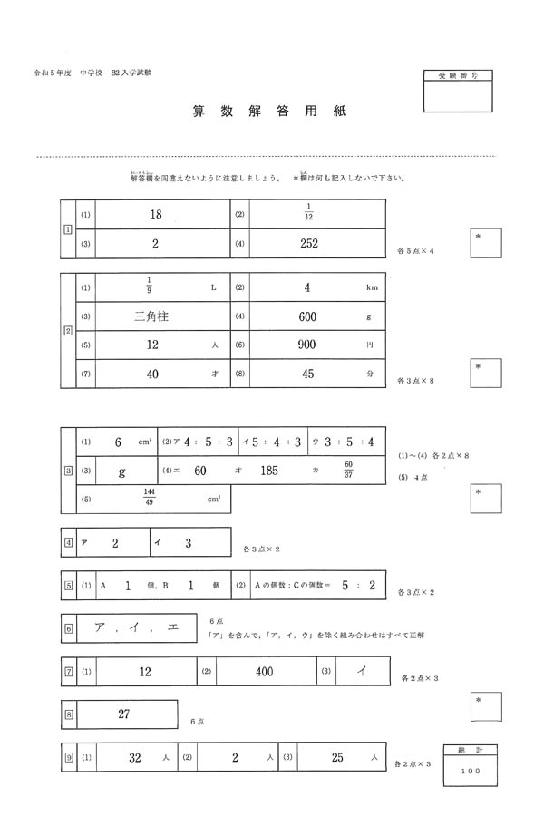 令和5年度入試過去問題 B2(算数 解答)(1ページ目)|龍谷大学付属平安中学校の入試過去問