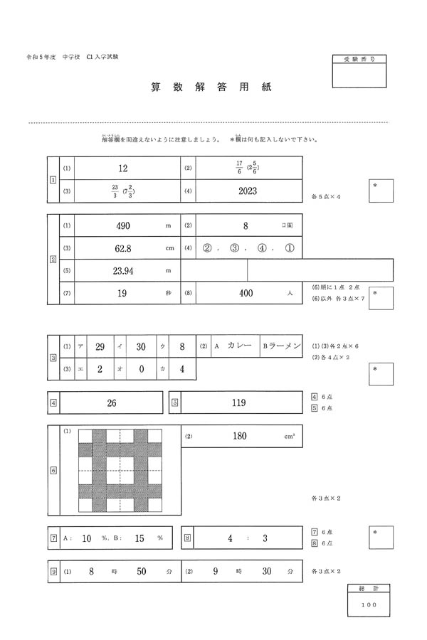 令和5年度入試過去問題 C1(算数 解答)(1ページ目)|龍谷大学付属平安中学校の入試過去問