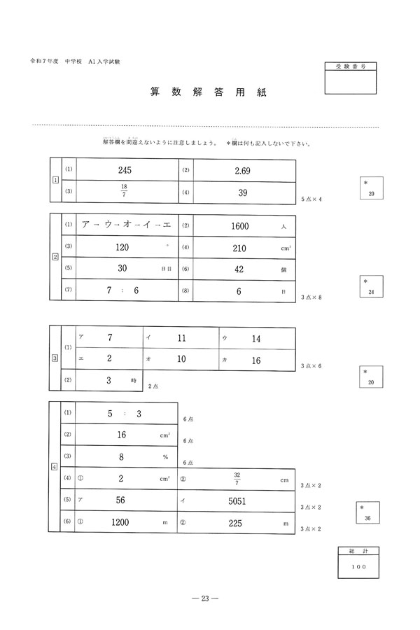 令和7年度入試過去問題(A1)(算数 解答)(1ページ目)|龍谷大学付属平安中学校の入試過去問