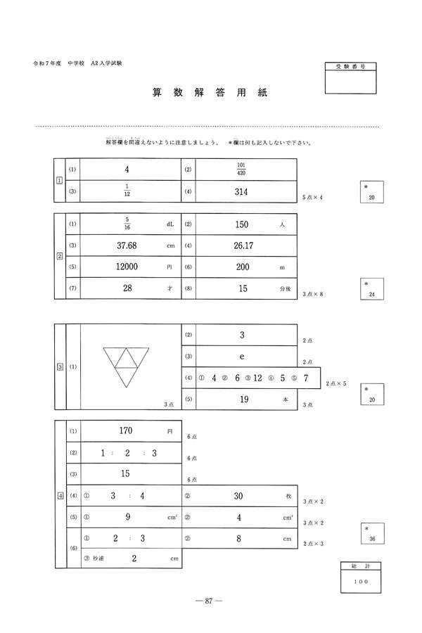 令和7年度入試過去問題(A2)(算数 解答)(1ページ目)|龍谷大学付属平安中学校の入試過去問