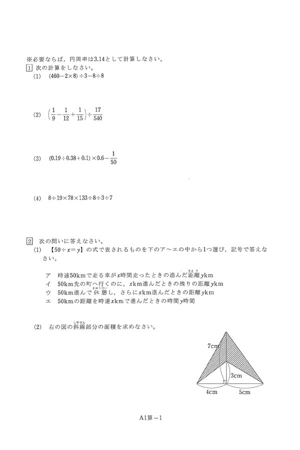 令和5年度入試過去問題 A1(算数 問題)(1ページ目)|龍谷大学付属平安中学校の入試過去問