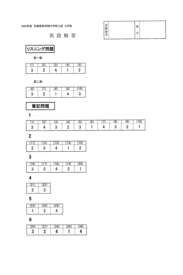 2024年度入試過去問題 A2日程(英語 解答)(1ページ目)|京都聖母学院中学校の入試過去問