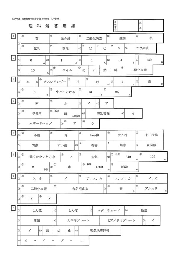 2024年度入試過去問題 B1日程(理科 解答)(1ページ目)|京都聖母学院中学校の入試過去問