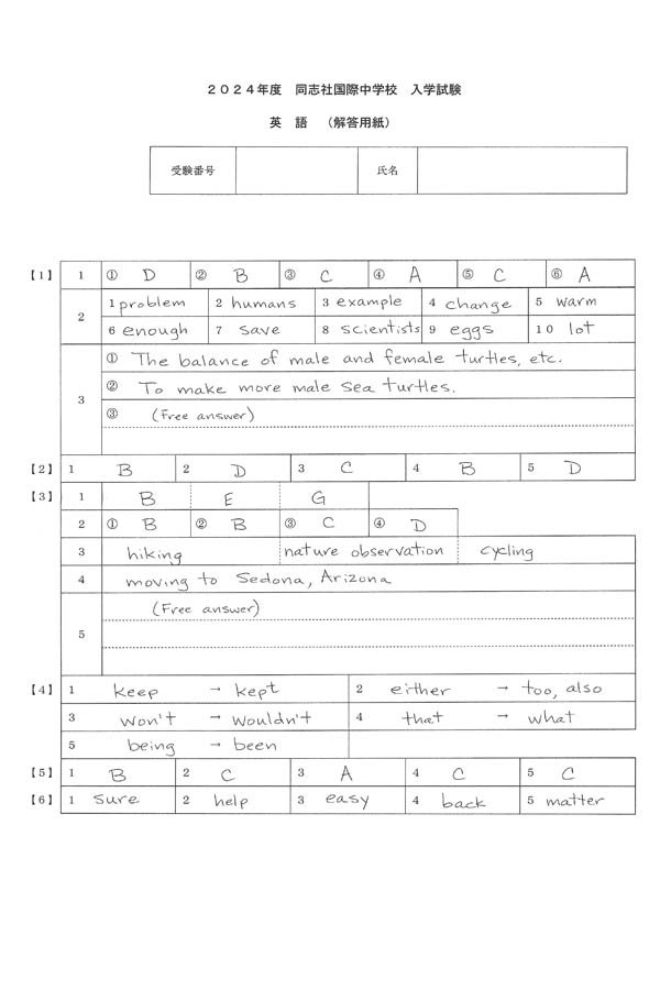 2024年度入試過去問題(英語 解答)(1ページ目)|同志社国際中学校の入試過去問