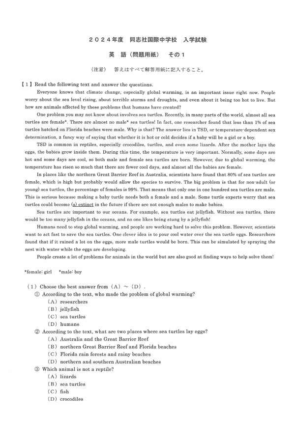 2024年度入試過去問題(英語 問題)(1ページ目)|同志社国際中学校の入試過去問