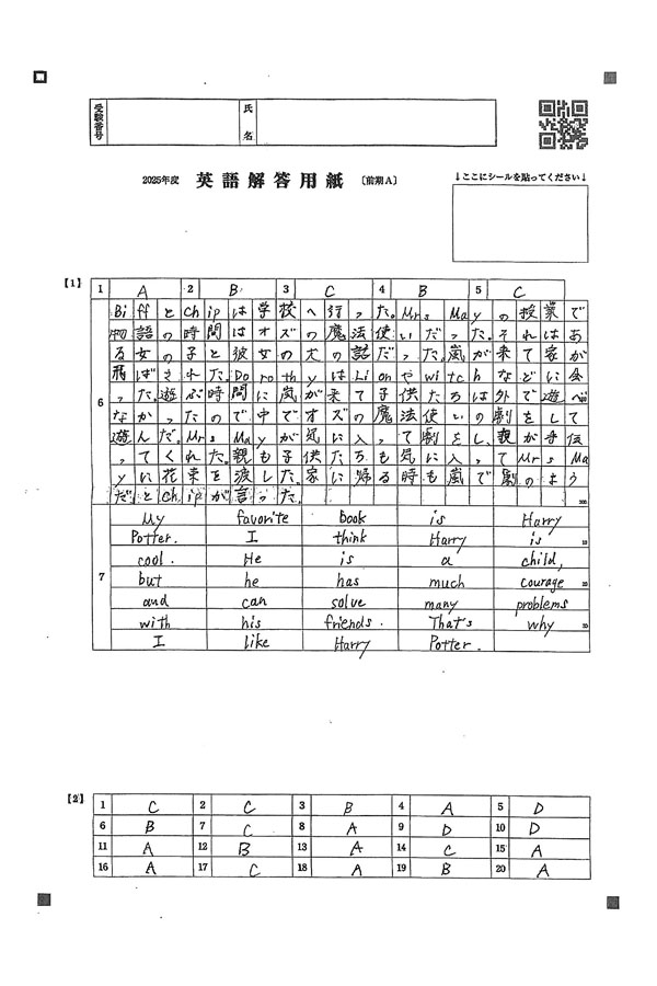 2025年度入試過去問題(前期A)(英語 解答)(1ページ目)|利晶学園大阪立命館中学校の入試過去問