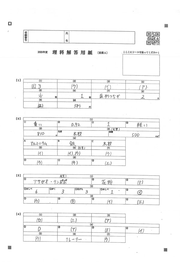 2025年度入試過去問題(前期A)(理科 解答)(1ページ目)|利晶学園大阪立命館中学校の入試過去問