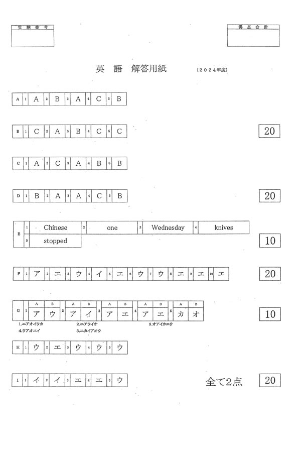 2024年度入試過去問題(英語 解答)(1ページ目)|梅花中学校の入試過去問