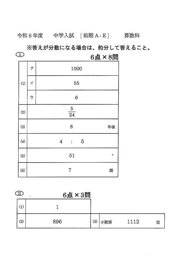 令和6年度入試過去問題 前期E入試(算数 解答)(1ページ目)|金蘭千里中学校の入試過去問
