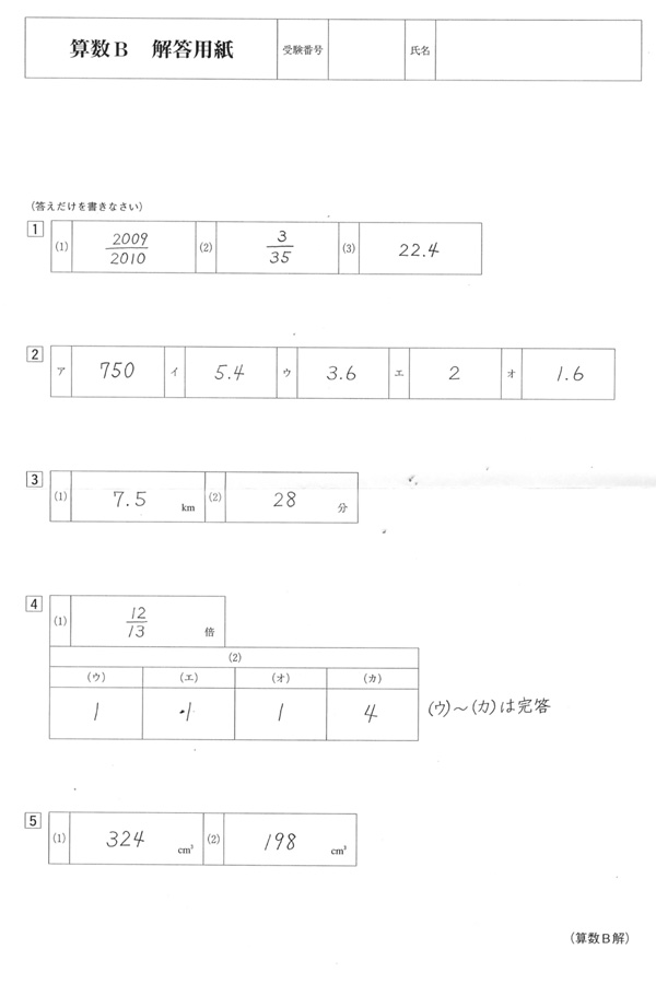 平成22年度入試過去問題 後期B(算数 解答)(1ページ目)|高槻中学校の入試過去問