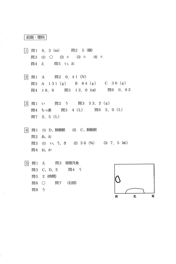 平成28年度入試過去問題 前期(理科 解答)(1ページ目)|高槻中学校の入試過去問