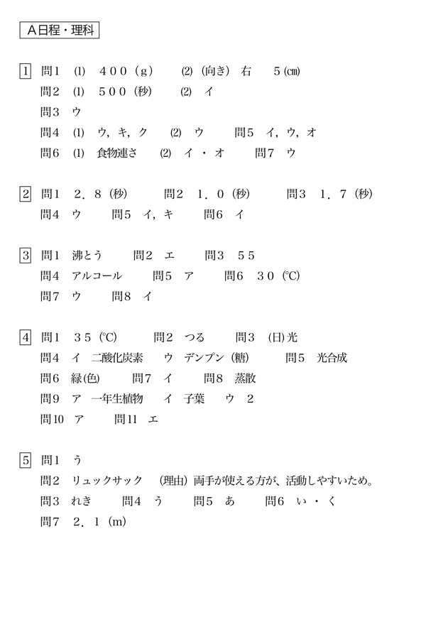 平成29年度入試過去問題 A日程(理科 解答)(1ページ目)|高槻中学校の入試過去問
