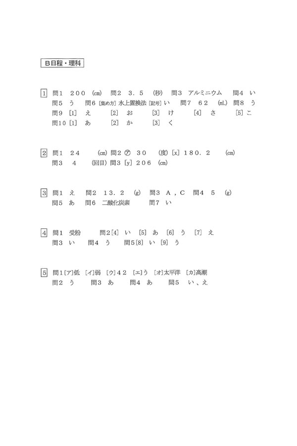 2020年度入試過去問題 B日程(理科 解答)(1ページ目)|高槻中学校の入試過去問