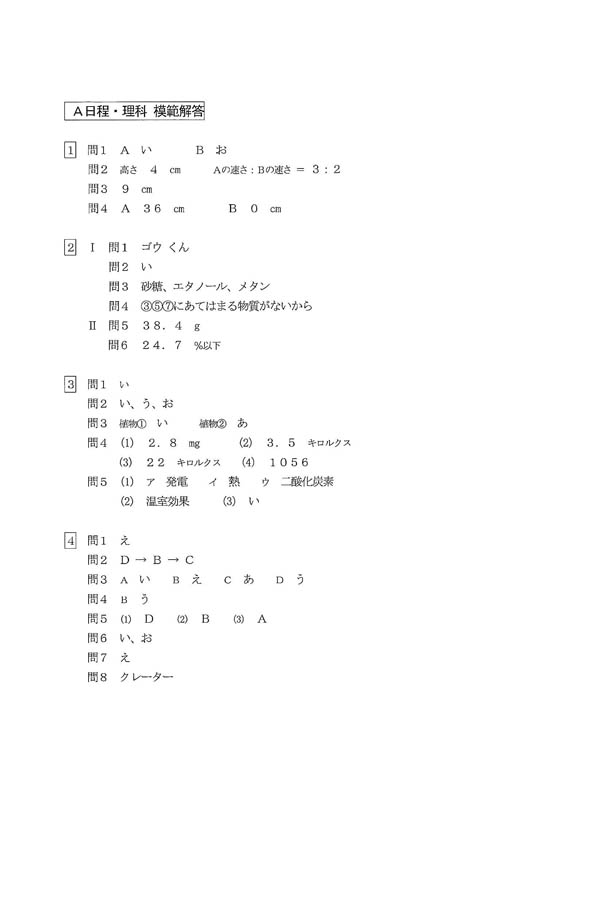 2024年度入試過去問題 A日程(理科 解答)(1ページ目)|高槻中学校の入試過去問