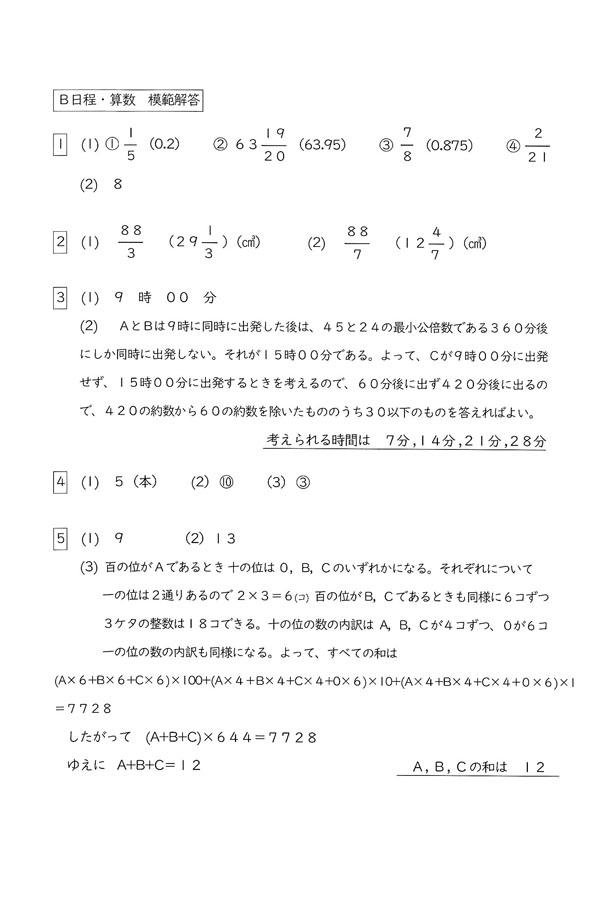 2025年度入試過去問題(B日程)(算数 解答)(1ページ目)|高槻中学校の入試過去問