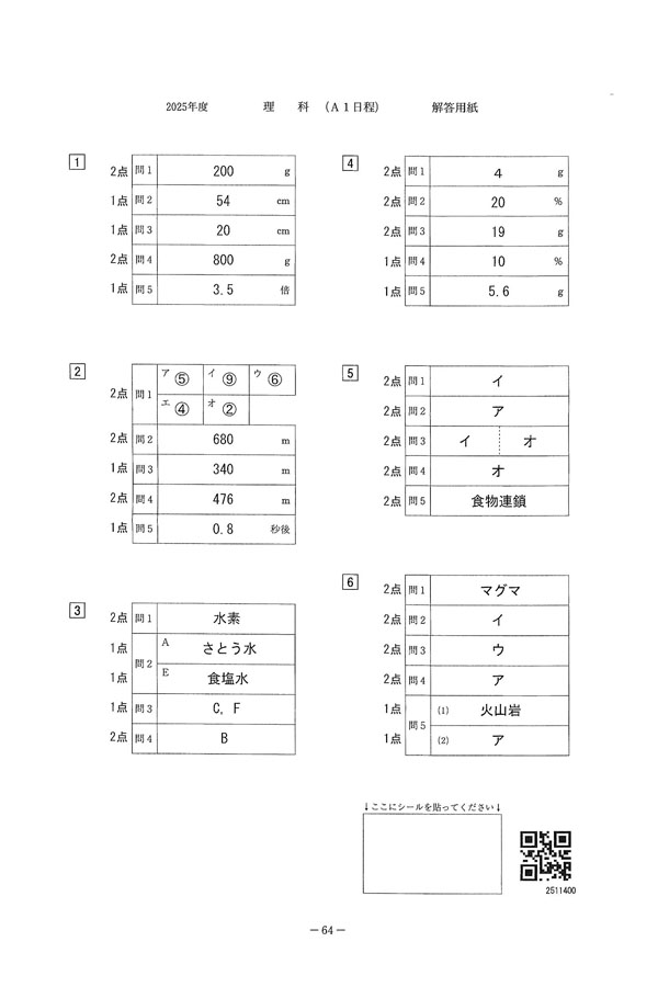 2025年度入試過去問題 A1日程(理科 解答)(1ページ目)|関西大倉中学校の入試過去問