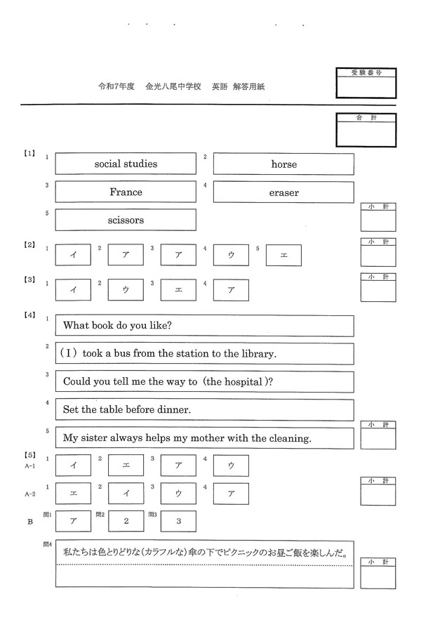 令和7年度入試過去問題(英語 解答)(1ページ目)|金光八尾中学校の入試過去問