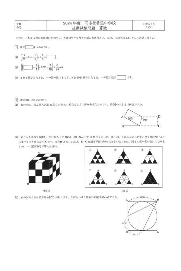 入試過去問(問題)(1ページ目)|同志社香里中学校の入試過去問